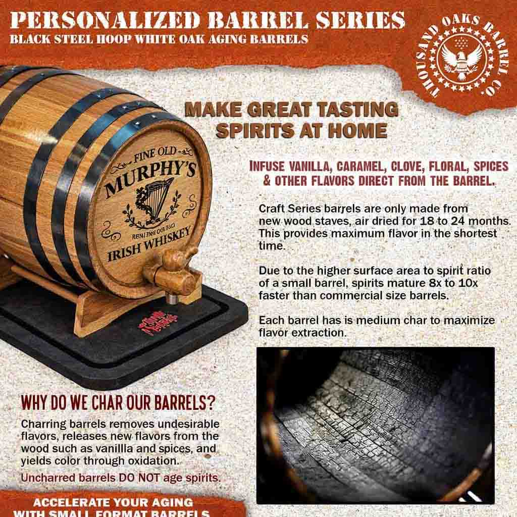 This small oak aging barrel is not decorative — it is a fully functional charred oak cask designed to mature and enhance Irish whiskey, bourbon, rum, tequila, scotch, and craft cocktails.