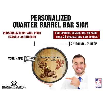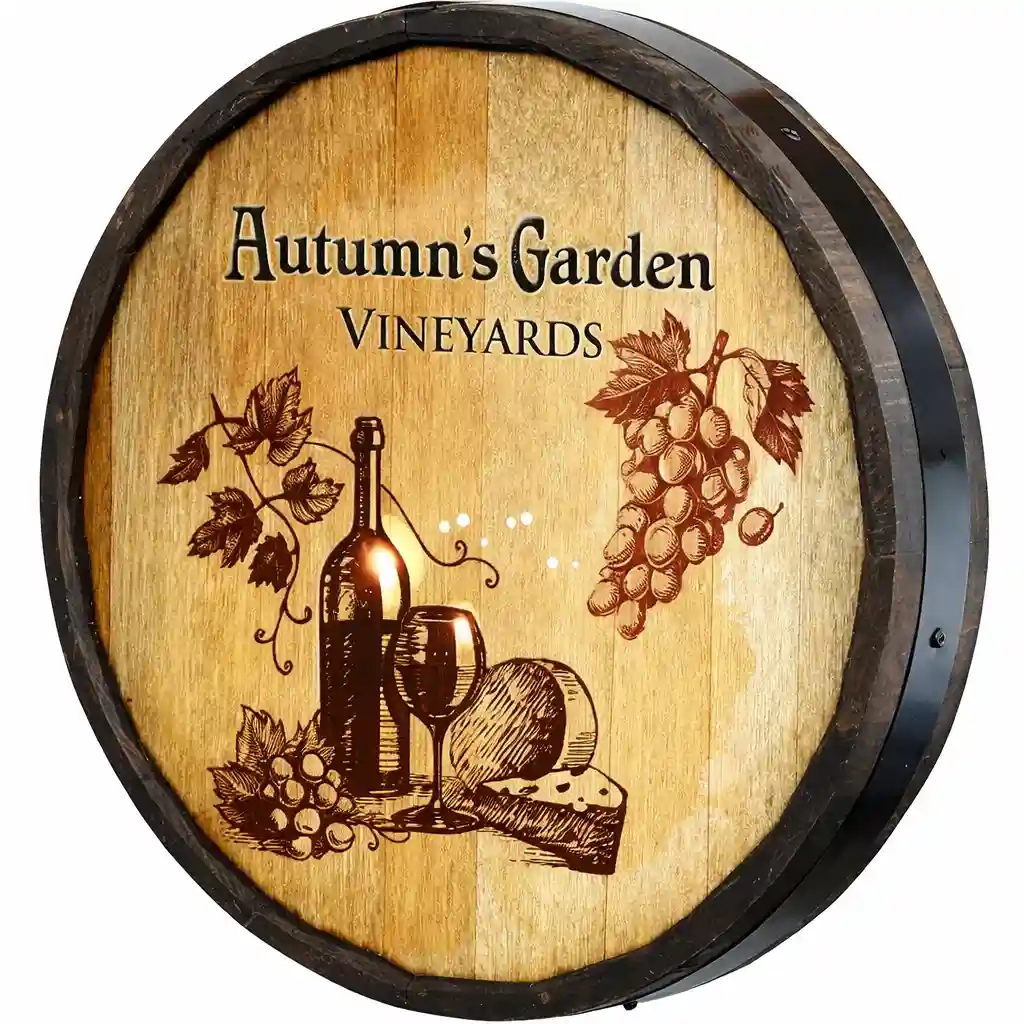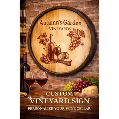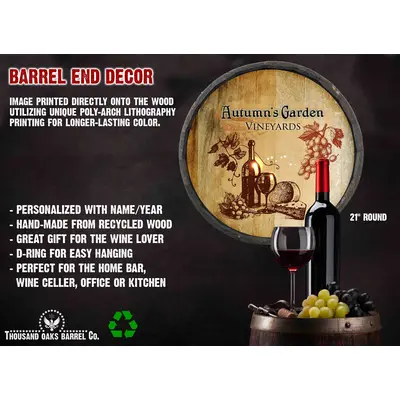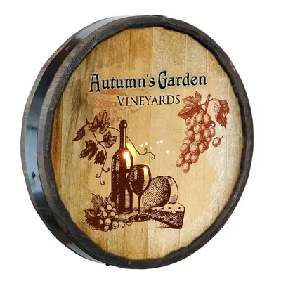 Elevate your wine cellar, tasting room, or home bar with this handcrafted Autumn’s Garden Vineyards Quarter Barrel Sign, a stunning 20”–21” round wooden barrel end wall piece designed to bring authentic vineyard charm and rustic sophistication into your space.